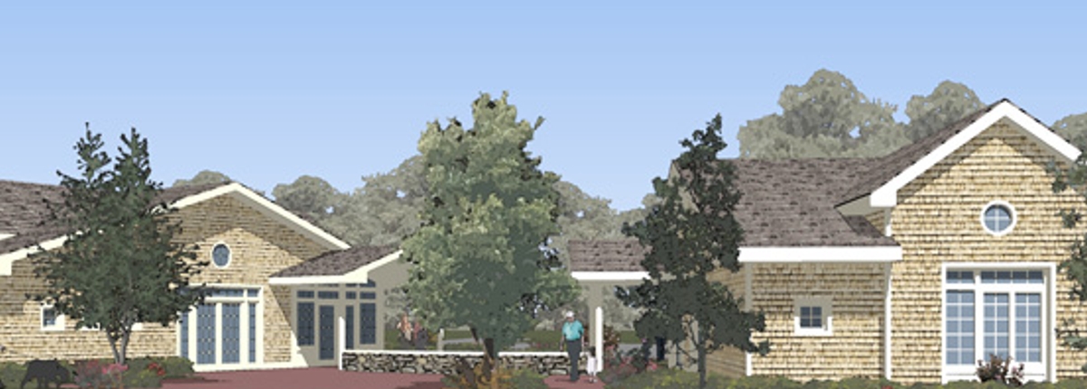 Group Living Facility on the green highlines of Lincoln Park, NJ. The twin houses are connected by a shared plaza facing the north. Each house serves four occupants and has communal kitchen, dining, living, laundry and terrace areas.