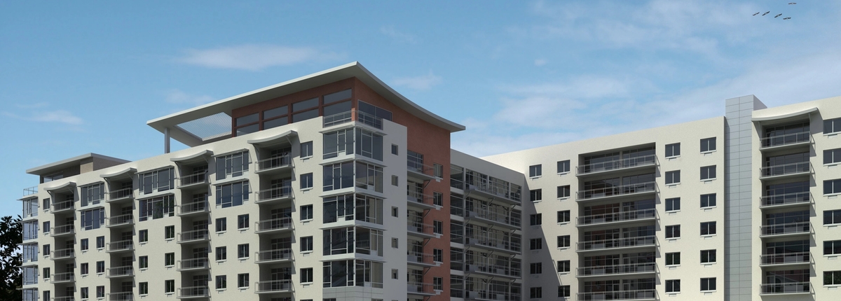 This nine story 340,000 square foot development is sited on a cliff overlooking the meadowlands with views toward the Watchung mountains. The project features 44 one-bedroom, 95 two-bedroom, and 8 three-bedroom units. All parking is located at the basement and ground floor levels. Two plaza spaces are situated above the ground level parking. Every unit has a balcony from its living space. The rooftop features a terrace with pool and jacuzzi, a gymnasium, and a social room.